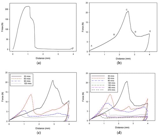 Variation of force deformation in common beans: (a) typical uncooked beans (b) typical cooked beans (c) cooked ETC cultivar (Masusu), and (d) cooked HTC cultivar (Msiska).