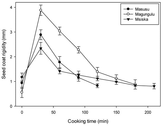 The evaluation of the seed coat rigidity/fracturability (Figure 4) shows that the dry seed coat is less rigid. The rigidity of the seed coat increased as it absorbed moisture and presented increased resistance to the probe during compression. This rigidity declined as the cooking time increased. The bean seed coat is composed of a thin cuticle above a layer of palisade cells. These palisade cells are prismatic and thick-walled contiguous cells [29]. The thickness of the palisade cells and the lignin and cellulose content of the seed coat are essential determiners of the cooking quality [29]. Seed coat thickness, seed volume, and protein content are known structural features responsible for water absorption [30]. It has been reported that beans with thinner seed coats absorb water more rapidly during the initial soaking of beans [31]. At higher temperatures such as those used in cooking, absorption could be higher, leading to higher initial resistance of the probe through the seed coat.
