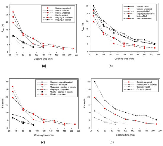 Effect of softening techniques on common beans cookability profile: (a) soaking before cooking, (b) cooking in NaCl solution, (c) cooking in potash solution, and (d) comparison of softening techniques for HTC cultivar (Msiska).