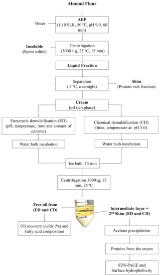 The AEP of almond flour and almond cake (the protein-rich meal generated by the mechanical expression of the almond oil) achieved oil extraction yields from 50 to 70% at laboratory scale [28,30]. However, only a reduced fraction of the almond oil was extracted as free oil (1 to 3%) [28,30]. As a matter of fact, 25–27% of the almond cake oil [30] and 40–64% of the almond flour oil [28], although extracted from their respective starting material, ended up entrapped in the cream emulsion. Therefore, the development of viable methods to demulsify the cream emulsion, a necessary step to increase the recovery of the extracted oil, is essential to maximize the feasibility of the AEP [31,32,33].