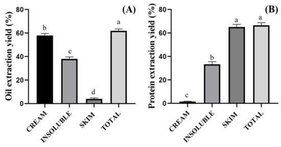 Extraction yields and distribution of oil (A) and protein (B) among the fractions generated (cream, insoluble, and skim) by the aqueous extraction process of almond flour. Different letters indicate a significant difference between extraction yields among the fractions within each compound (oil and protein) by the Tukey’s test (p < 0.05).