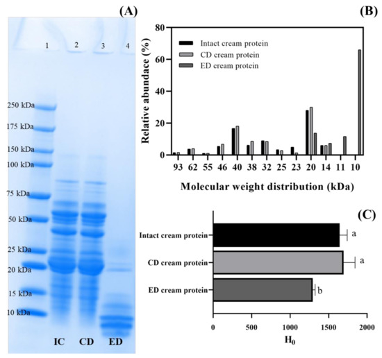 sodium dodecyl sulfate-polyacrylamide gel electrophoresis (SDS-PAGE) of cream proteins (A), Lane 1: molecular weight standard (10–250 kDa), Lane 2: intact cream (IC) protein, Lane 3: chemically demulsified (CD) cream protein, and Lane 4: enzymatically demulsified (ED) cream protein; molecular weight distribution and relative abundance of the cream proteins (B); protein surface hydrophobicity (H0) of the cream proteins (C). Different letters indicate a significant difference (p < 0.05) among the samples.