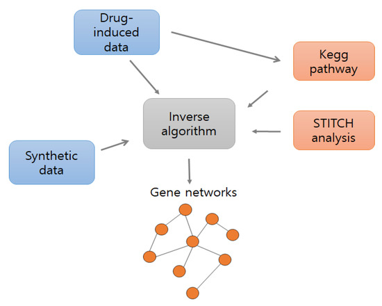 The existing gene set enrichment analysis (GSEA) tool was employed to find drug associated enrichment pathways by calculating the enrichment score of gene expression level based on the Kolmogorov–Smirnov statistical test [28]. In addition, we used open source analysis STITCH, which offers networks between 1.5 million genes, 2200 drugs, and 68,000 chemicals. To identify enrichment pathways, we compared cancer datasets to normal datasets; to identify relationships between genes in the selected pathways, we used only cancer datasets. In Figure 1, blue boxes represent input datasets, orange boxes represent input pathway information and the gray box identifies gene–gene networks.