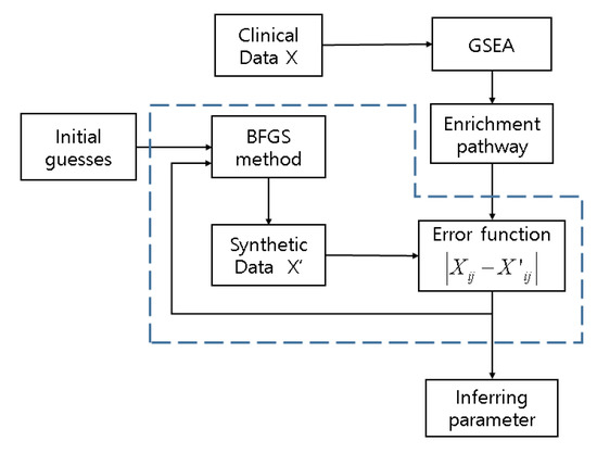The element of matrix W represents the influence of the th gene on th gene which we refer to as interaction weight. represents logarithm base 2 of the expression level of MCF7 breast cancer datasets downloaded from Gene Expression Omnibus (GEO). represents the synthetic datasets generated based on a clinical dataset with white noise using Gaussian distribution such as . The flowchart of the proposed scheme is shown below (Figure 2). The algorithm iterates until the stop criteria in the blue dotted-line box are satisfied to infer parameters .