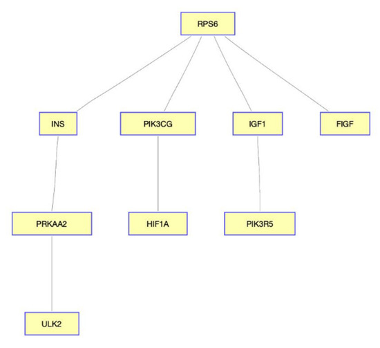 Diagram of the gene interaction network in MTOR signaling pathway. RPS6 plays an important role in MTOR signaling pathway, implying the possibility of the drug-targeted genes.