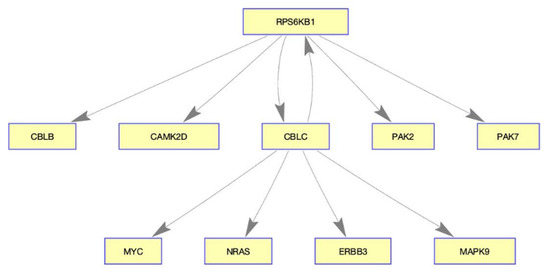 The selected validation of our results are presented as follows: p21-activated kinase 2 (PAK2) is known to play a critical role in breast cancer cell invasion [39], and p21-activated kinase 7 (PAK7) is another known oncogene [40]. Our method shows that PAK2 and PAK7 are inhibited by RPS6KB1 which responds to LY294002. However, RPS6KB1 is overexpressed in various cancers, implying the likelihood of poor prognosis [41,42,43]. In the previous experiment study, Cbl proto-oncogene C (CBLC) was identified as regulating PARP in breast cancer [44]. Discrimination of the presented method from previous works is to discover interaction genes rather than individual markers. As an example, the gene interaction within the pathway presented in Table 3 is schematically illustrated in Figure 4, which may help understanding systemic drug efficacy.