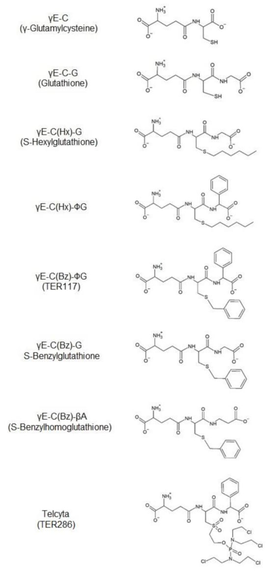 In particular, the compounds originally designated TER117 (γ-L-glutamyl-S-(benzyl)-L-cysteinyl-R(-)-phenylglycine) and TER286 (γ-glutamyl-α-amino-β-(2-ethyl-N,N,N′,N′-tetrakis(2-chloroethyl)phosphorodiamidate)sulfonylpropionyl-R(-)phenylglycine were of interest. Both substances are S-substituted glutathione molecules in which glycine has been replaced by R(-)-phenylglycine, and, thereby, affording enhanced selectivity for binding to GST P1–1 rather than to other GSTs [13]. The compounds have therapeutic potential in divergent applications and via different mechanisms. TER117 promotes the proliferation and maturation of hematopoietic precursor cells, granulocytes, monocytes, erythrocytes, and platelets [14,15]. It is administered as the di-esterified molecule called Telintra or Ezatiostat, which, intracellularly, is hydrolyzed to TER117. By contrast, TER286, with the commercial name Telcyta or Canfosfamide, is an anti-proliferative drug of the nitrogen mustard type designed to target GST P1–1-expressing tumors [16,17].