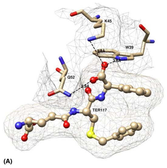 GST P1–1 binds GSH by an array of amino acids residues that form a number of salt bridges and hydrogen bonds. GSH has a carboxyl group at either end of the molecule, providing two negative charges, which are involved in electrostatic interactions with the protein. The γ-glutamyl carboxyl group is surrounded by Ser66 and Argl4 in which the latter was the subject of an earlier investigation [12]. The glycine carboxyl group, on the other hand, is surrounded by Lys45, Gln52, and Trp39, forming a salt bridge and two hydrogen bonds (Figure 2A). TER117 and TER286 both feature R(-)-phenylglycine, and this bulky and stereospecific substitution was of particular interest in the present investigation.