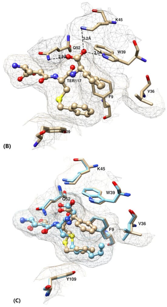 The benzyl analog of the above ligand, γE-C(Bz)-∅G (TER117), shows a different picture: mutants Q52A and K45A both cause a loss in binding strength of approximately 8 kJ mol−1, reflecting the binding energy characterizing each of these two separate interactions. Q52K gives an additional loss of 4.4 kJ mol−1, which corresponds to the result obtained with γE-C(Bz)-∅G. With γE-C(Bz)-∅G, the Q52K mutation is, therefore, the most consequential one, giving the highest absolute loss of binding energy (−12.4 kJ mol−1) of all values (Table 5). On the other hand, the same ligand is found to be a potent inhibitor with wild-type enzyme GST P1–1, indicating a role of residue Q52 in positioning the phenyl group in the hydrophobic binding cavity in the G-site of the enzyme (Figure 2B).