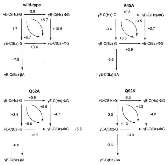 where Ki* is the inhibition constant for wild-type enzyme inhibited with S-hexylglutathione, which was used as a reference (Table 5). The relationships among the G values have been arranged into a thermodynamic cycle, which demonstrates additivity of the alterations and, thus, internal consistency of the data (Figure 3). As the enzyme reference, the wild-type variant was chosen for clear reasons, and, in the case of the ligands, γE-C(Hx)-G, since this is an inhibitor with a defined binding mode in the H-site [9,10]. The additivity signifies that no major secondary changes overrule the primary effects of the changes in structure of the enzyme as well as inhibitor. The calculated energy values, expressed as differences between the reference set and each particular mutant with the five GSH analogs, allow the estimation of the influence of particular side-chain alterations in the G-site of the substrate as well as in the bound ligand (Table 5).