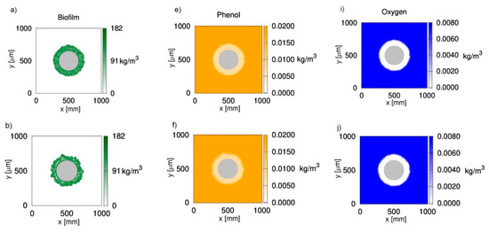 Figure 1 shows two-dimensional distributions of biomass (Figure 1a–d), phenol (Figure 1e–h) and oxygen (Figure 1i–l) concentrations at different growth times t for biofilm grown on a particle with a radius equal to 150 μm. The chosen value corresponds to sand particles commonly used in fluidized-bed bioreactors. The results presented in Figure 1 were obtained with the use of CA-1, i.e., with the negligence of cell death and lysis. It was accepted that, at an initial time, the particle is uniformly covered with biomass of density equal to . The concentrations of phenol and oxygen in the bulk liquid were equal to 0.02 kg/m3 and 0.008 kg/m3, respectively. The chosen dissolved oxygen concentration is close to the saturation state.