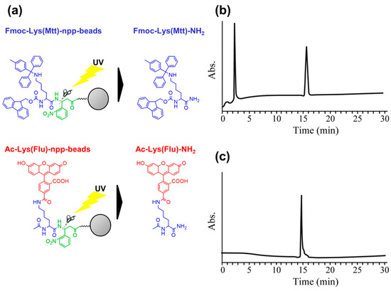 After optimizing the synthesis protocol [15], we assessed the purity of the beads loading the amino acids. We synthesized the dipeptide Fmoc-Lys(Mtt)-npp onto the magnetic microbeads (Figures S1 and S2, Supplementary Materials). The photo-labile npp linker [16,17] was used to release Fmoc-Lys(Mtt) moieties from the beads upon UV irradiation (Figure 2a). Following the coupling of Fmoc-npp-OH and Fmoc-Lys(Mtt)-OH and subsequent photo cleavage, the purity of the peptide was assessed using HPLC by monitoring the absorbance of the Fmoc moiety at 301 nm. The HPLC chromatograph showed a peak at 15.5 min, corresponding to the product Fmoc-Lys(Mtt)-NH2 (Figure 2b). Similarly, we also optimized and confirmed the Mtt deprotection protocol in DMSO. Following N-terminal deprotection and acetylation, the Mtt group on the sidechain was removed from the dipeptide and 5(6)-carboxyfluorescein was coupled to the free amine of the Lys side chain to obtain Ac-Lys(Flu)-NH2. After photo cleavage from the beads, we assessed the purity of the product by HPLC by monitoring the absorbance of the fluorescein moiety at 490 nm. A clear peak at 14.5 min for the target product was obtained, indicating successful Mtt deprotection in DMSO (Figure 2c).