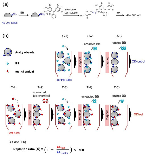 (a) C-SPRA-MB method with UV detection of bromophenol blue (BB). (b) Schematic representation of the procedures for using a magnet holder and separator in C-SPRA-MB and assessing skin sensitization. The procedure is as follows: (T-1) a test chemical was added; (T-2) after the reaction process (24 h), the Ac-Lys beads were washed; (C-1 and T-3) and the BB was added to Ac-Lys beads; (C-2 and T-4) the unreacted BB was removed out by washing with the solvent; (C-3 and T-5) the release solution (saturated Lys solution) was added for removal and collection of reacted chromophores, and ODcontrol and ODtest were obtained by UV measurement; (C-4 and T-6) the depletion ratio was calculated from ODcontrol and ODtest.