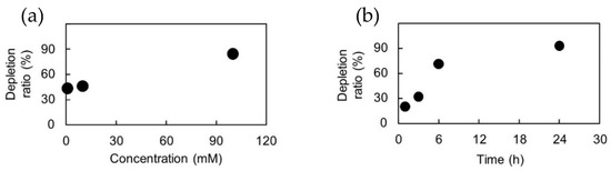 We attempted to find suitable conditions of the measurement of Ac-Lys beads reactivity protocol as shown in Figure 3b using FITC as a representative sensitizer. Percent depletion represented the reactivity of test chemicals to Ac-Lys beads. Conditions such as concentration of the test chemical and deration of reaction were evaluated to determine the suitable reaction protocols. Initially, we measured the dose–response curves of FITC to determine the suitable test chemical concentration. FITC depletion ratio increased in a dose-dependent manner, with a maximum depletion ratio at 100 mM, whereas at 1- and 10-mM concentration of FITC low ratios were obtained (44% and 46%, respectively) (Figure 4a). These results implied that C-SPRA-MB might assess potent sensitizers even in 1 and 10 mM and that Ac-Lys beads can judge sufficiently to potent sensitizers at a concentration of 100 mM, which is the concentration of test chemical typically required for the conventional DPRA protocol. Therefore, we selected a test chemical concentration of 100 mM in the following experiments. Further, we evaluated the reaction kinetics using 100 mM FITC. As C-SPRA-MB using FITC showed time-dependent depletion ratios, C-SPRA-MB may be able to offer kinetic experiments with much shorter reactions than 1 or 3 h. The maximum depletion ratio was observed at 24 h for FITC (Figure 4b), which is the same as the conventional DPRA and ADRA protocol. Thus, in the final protocol, Ac-Lys beads were incubated with 100 mM test chemicals for 24 h at 20–25 °C.