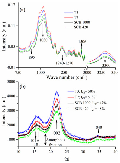 (a) Fourier Transformed Infrared (FTIR) spectra and (b) X-ray diffractograms and Icr for un- and pretreated SCB samples. Footnote: SCB 1000 and SCB 420 correspond to unpretreated materials with particle sizes of 1000 and 420 µm, respectively.