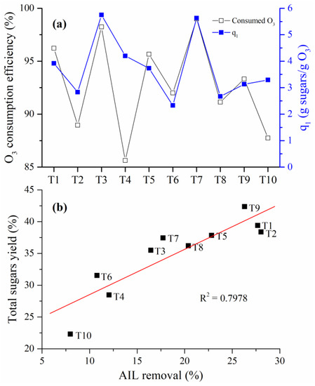 (a) Ozone consumption efficiencies and sugars released to expended ozone ratio (q1) at different experimental conditions. Note: The amount of sugars is the sum of glucose and xylose contents. (b) Relationship between total sugars yield (glucose and xylose) and AIL removed.