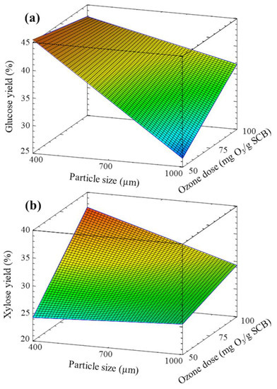 Interestingly, ANOVA analysis showed that the moisture content did not impact the glucose and xylose yields of ozonated enzymatically hydrolyzed SCB, confirming the results discussed in Section 3.4. The effect of particle size on the glucose yield proved to be statistically significant (p < 0.05), which is in accordance with the study reported by Eqra et al. [15], but disagrees with the findings of Travaini et al. [4] who concluded that ozone concentration is the most important parameter for sugar release. A significant effect of ozone dose on the xylose yield was also found. By contrast, there were no significant interaction effects among the three factors. Figure 5 shows the estimated response surfaces for (a) glucose and (b) xylose yields, illustrating that higher glucose yields could be obtained at 420 µm and 50 mg O3/g SCB, while higher xylose yields could be reached at 420 µm and 100 mg O3/g SCB. Response surfaces showed different curvature effects; particularly, the curvature is located at the lowest ozone dose and the largest particle size levels for glucose yield, while for xylose yield, it is at the highest ozone dose and the smallest particle size levels, suggesting that curvature effects should be considered to accurately predict the process.