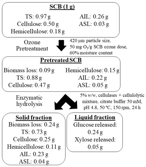 A mass balance of the ozonation of SCB is presented in Figure 7. The balance, based on 1 g of SCB, took into account the total solids content, the relative biomass loss, and the changes in the content of cellulose, hemicellulose, AIL and ASL in the un- and pretreated bagasse, as well as the total sugars released after the enzymatic hydrolysis. The amount of 1 g of SCB contained 0.97 g of total solids and 0.5 g of cellulose. To figure out the changes in mass balance after ozonation, the run T3 was selected owing to its maximum sugars released/ozone consumption ratio (q1). After ozone pretreatment, the total solids content decreased from 0.97 g to 0.88 g, corresponding to a biomass loss of 8.7%. As discussed in Section 3.1, the loss of mass was mainly explained by the degradation of hemicellulose and AIL. Regarding the cellulose fraction, it suffered a slight degradation from 0.5 to 0.47 g. After enzymatic hydrolysis, a bagasse recovery of 0.7 g was achieved in the solid fraction, with cellulose and hemicellulose contents of 0.25 and 0.11 g, respectively. The mass balance also considered the resulting liquid fraction after enzymatic hydrolysis, in which the release of glucose and xylose into the hydrolyzed liquor was 0.24 and 0.05 g, respectively.