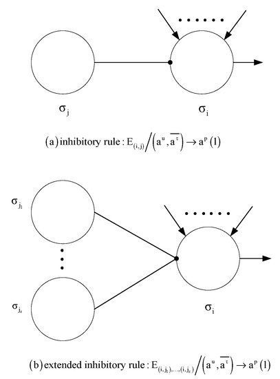 - the form of inhibitory rules is , where the subscript represents an inhibitory arc between neuron and , , , , , and ;