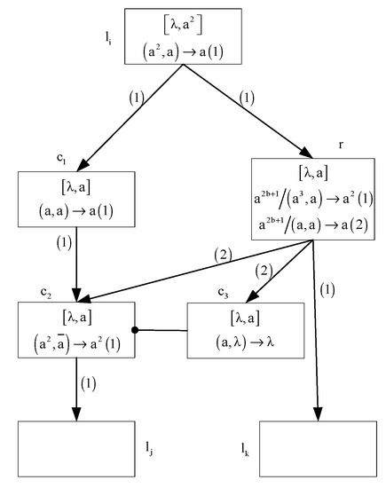 If neuron meets firing conditions during calculation, then one of the rules in must be used. If two rules and in neuro n can be applied to configuration at the same time, only one of them can be applied. According to the maximum spikes consumption strategy of DTNP-MCIR systems, when , the rule is applied, otherwise, the rule is applied, when , one of them will be non-deterministically selected. Note that this strategy is also effective for forgetting rules. For example, two rules and both satisfy firing conditions at time t, since the firing of forgetting rule consumes three spikes, however, the spiking rule only consumes one spike, then the forgetting rule will be chose and applied.