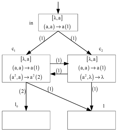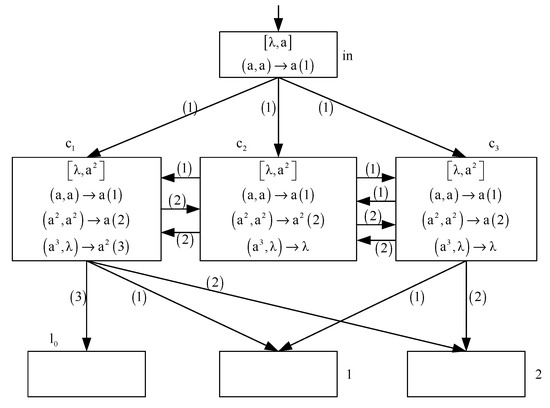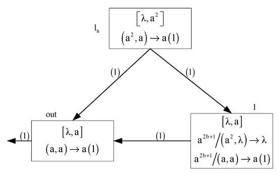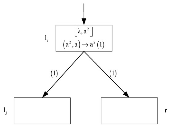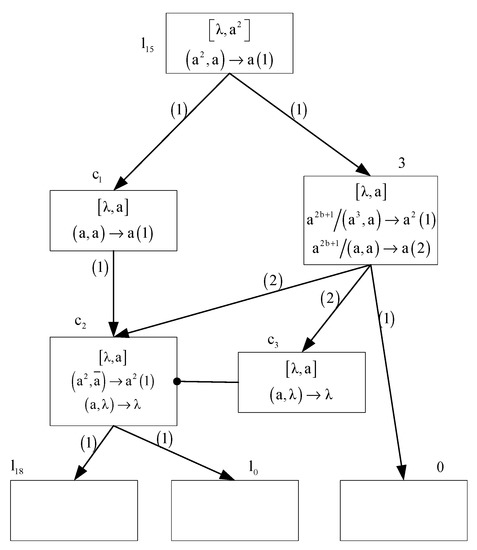 By observing Table 1, we can find that all ADD instructions have the form , therefore, we use the deterministic ADD module shown in Figure 7 to simulate the ADD instructions. Its working mechanism has been clarified in the proof of Theorem 2.