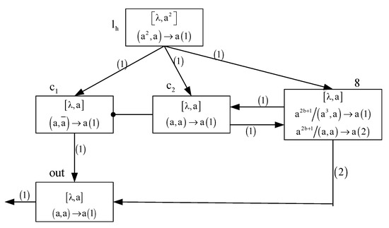 When neuron receives two spikes at time t, the calculation of the system halts. The OUTPUT module shown in Figure 9 is used to deal with the calculation results. We assume that neuron contains 2n spikes. The configuration of OUTPUT module at time t is , which involves fives neurons respectively. Thus, . Rule is enabled, and neuron sends one spike to neurons and via channel (1) at time t. Therefore, . Since neuron is the inhibitory neuron of neuron and , rule is applied, neuron sends a spike to neuron . Rule in neuron and rule in neuron are also enabled. Although the rule consumes three spikes of neuron , because neuron and neuron exchange one spike with each other via channel (1), neuron only consumes two spikes each moment. Thus, . Rule is applied in neuron , then the first spike is sent to the environment at time t + 2. Rule will be executed continuously until neuron contains only one spikes. At time t + n + 1, neuron contains only a spike, rule is applied and neuron transmits a spike to neuron via channel (2). At time t + n + 2, rule is applied, neuron sends the second spike to the environment. According to the definition in Section 2, the result of the system is , which is also the number contained in register 8.