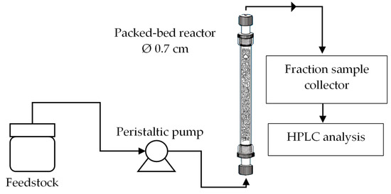 Figure 1 shows a schematic diagram of a continuous transesterification system in the concurrent up-flow configuration. The catalyst was packed inside a simple glass column (Ace Glass Inc., New Jersey, USA) with an inner diameter of 0.7 cm and a height of 15 cm. The reactor and peristaltic pump line were initially test run using the water to detect any leakage followed by the test of the chosen parameters required to carry out a continuous transesterification of palm oil and ethanol in the present of kenaf catalyst. The bed porosity, εb is the fraction of the volume of space between the solid particles of the catalyst to the total empty reactor volume and it is defined using the following Equation (1).
