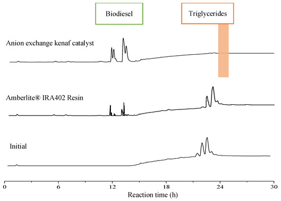 The physical and chemical properties and conversion yield of anion exchange kenaf catalyst (NaOH-TMA-VBC-g-kenaf) that has been compared with commercial ion exchange resins (Amberlite® IRA402 resin) are summarized in Table 2. The comparison between both anion exchangers was conducted under similar conditions. As shown in Figure 2, the high intensity of FAEEs and no presence of triglycerides peaks were recorded in transesterification with anion exchange kenaf catalyst, which indicates high catalytic activity (100% biodiesel conversion). In addition, after completing a 24 h reaction, only one phase final product was observed using the kenaf catalyst. However, Amberlite® IRA402 resin has shown a two-phase layer and the lowest yield of FAEEs (28.43% conversion) compared to the fabricated anion exchange kenaf catalyst. The presence of triglycerides peaks in the spectra demonstrates that the palm oil was not fully converted using Amberlite® IRA402 resin. As expected, this is most likely due to the modified kenaf fiber coated with highly active sites of the trimethylamine group compare to Amberlite® IRA402 resin. Furthermore, the speed of reaction using porous anion exchange resins is rather slower than the fibrous type because the catalyst has a reaction site inside the pores and needs a longer time for sample diffusion [12]. Thus, it required a high resin catalyst concentration to accelerate the transesterification process. Surprisingly, anion exchange kenaf is far more astonishing in terms of catalytic performance since it was able to completely convert palm oil to biodiesel with low catalyst concentration (0.1 g) at a low temperature. Since the results of transesterification showed that fabricated anion exchange kenaf catalyst effectively converts oil to biodiesel, thus, it is ready to be loaded in a packed-bed reactor for a continuous transesterification process.