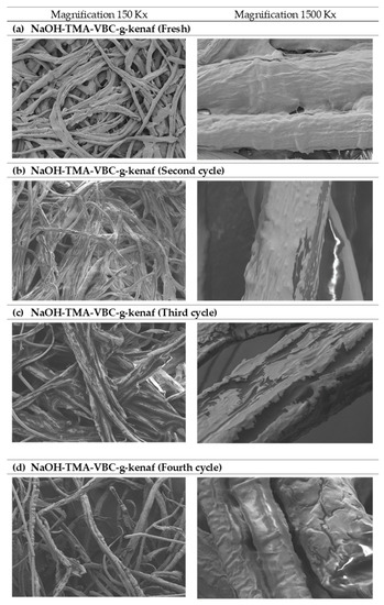 The field emission scanning electron microscope (FESEM) images of (a) NaOH- trimethylamine (TMA)-5 wt%, 4-vinyl-benzylchloride (VBC)-g-kenaf (fresh), (b) NaOH-TMA-VBC-g-kenaf (second cycle), (c) NaOH-TMA-VBC-g-kenaf (third cycle) and (d) NaOH-TMA-VBC-g-kenaf (fourth cycle).