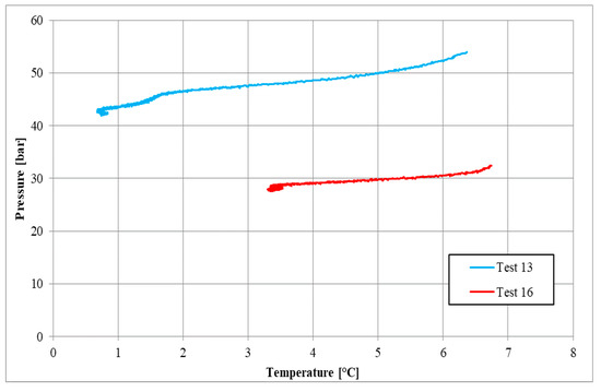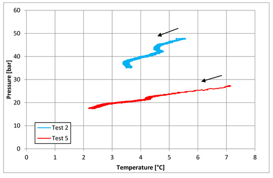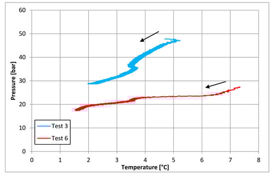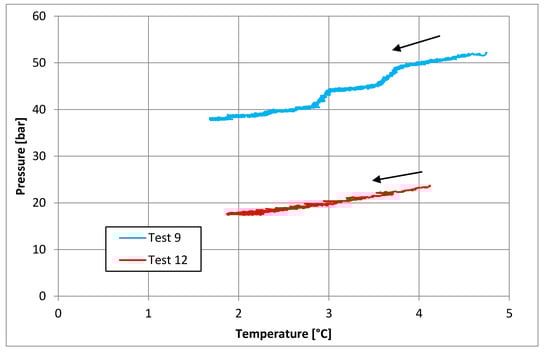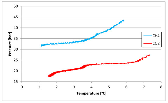 Thermodynamic equilibrium conditions feasible for a comparison with results here registered are related to the temperature range of 1.3–3.7 °C, whose corresponding pressure values are equal to 1.69–3.53. In such a case, while the lower values are completely comparable, the upper values are slightly higher than the results shown in Section 3.2 and Section 3.3. However, the present comparison highlighted a high degree of similarity between the results produced in experiments here described and equilibrium data already present in the literature.