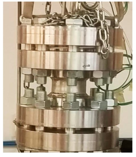 The lab-scale reactor adopted for the following experimental section has already been used for other different types of experiments and a detailed description is available elsewhere in the literature [25,34,47]. However, in this paragraph, its main characteristics are briefly summarized. The whole reactor was realized with 316SS stainless steel and has an internal cylindrical volume of 949 cm3; in particular, the diameter is equal to 7.3 cm while the internal height is around 22.1 cm. Both the upper and the lower surface of this volume are sealed with two 316SS stainless steel flanges (both of them composed by two 4.7 cm thick plates).