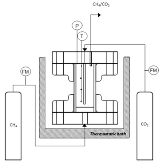 Numeric results related to this diagram are shown in Gambelli and Rossi (2019) [48] and were obtained using the same experimental apparatus adopted for the present work, which will be briefly described in Section 2. In Figure 1, the region between methane (red color) and carbon dioxide (blue color) curves represents the set of all pressure–temperature values which make the CO2–CH4 replacement process feasible. The experimental section of this work is involved in investigating if the dimensions of this thermodynamic area may change in the presence of salt water. An increase in the pressure and temperature range feasible for the replacement could make this process easier and could increase its efficiency. The possibility of using a classical inhibitor compound for the hydrate formation process, as a promoter of the replacement of methane contained in hydrates with carbon dioxide, was also supported by several experimental results already present in the literature. Ng and Robinson [49] proved that acetone is a promoter for methane hydrate formation. However, the usage of excessive quantities of it (>0.06 mole fraction) leads to hydrate formation inhibition. If acetone is able to act as a promoter for methane hydrate formation, Javanmardi et al. [50] proved that, in the case of R22 hydrate formation, acetone has only an inhibiting effect. Finally, a clear motivation of the necessity to experimentally verify differences in inhibitors behavior is provided in Maekawa [51]: “Thus the inhibiting or promoting effect of acetone on clathrate hydrate formation depends on its concentration in solution and the type of guest gas molecule”. In Yokoi S. et al. (1993) [52], it was proven that some cyclic ethers, such as tetrahydrofuran, 1,4-dioxane and 1,3-dioxilane, are able to promote CH4 hydrate formation in a manner similar to acetone. Jager et al. (1999) [53] evaluated methane hydrate formation in the presence of several concentrations of 1,4-dioxane and concluded that, at concentrations higher than 0.06 mole fraction, this compound is able to reduce the methane hydrate equilibrium pressure. Moreover, 1,4-dioxane and 1,3-dioxolane may also act as promoters for carbon dioxide hydrate formation; however, these compounds are chemical inhibitors of ethane hydrate formation [51]. A further example is provided by Maekawa T. (2011) [54], where acetone was found to be a chemical inhibitor of propane until concentrations were lower than 0.16 mass fraction. Methylcyclohexane is a good methane hydrate promoter but, at the same time, is an inhibitor of hydrate formation of CH4/C2H6/C3H8 mixtures [55]. Maekawa T. (2008) [56] defined the equilibrium conditions of CH4 hydrate in water containing 2-propanol. Results produced were useful to confirm the thermodynamic model introduced in Ostergaard K.K. et al. (2002) [57], where 2-propanol was suggested as an additive able to act as an sII former for methane hydrate. Then, Ohmura R. et al. (2004) [58] carried out methane hydrate formation tests with a 16.4% mass aqueous solution of 2-propanol and then used the X-ray diffraction analysis to confirm the formation of sII hydrate containing both methane and 2-propanol. Thus, a classical chemical inhibitor may act as a promoter for a specific compound. Pahlavanzadeh H. and colleagues (2019) [59] proved the ability of 1,3,5-trioxane and 2,5-dihydrofuran to act as good chemical promoters, especially if coupled. However, 2-methyl-2-propanol acts as an effective chemical inhibitor in the presence of carbon dioxide. All these examples prove how several different chemical compounds were tested on a single-species hydrate or in the case of gaseous mixtures, in order to prove variations in their inhibiting/promoting characteristics in the presence of the guest species and in relation to their concentration. However, in this direction, the presence in the literature of experimental data about sodium chloride needs to be improved and deepened. In this direction, some researchers produced encouraging data about the contemporary use of salts and chemical promoters such as Tetra-butylammonium-bromide (TBAB.) Sangway J.S. and Oellrich L. (2014) [60] tested semiclathrate hydrate of methane and TBAB in the presence of NaCl in aqueous solution. They concluded that for wNaCl equal to both 0.03 and 0.1, NaCl well inhibited methane hydrate in the presence of 0.2 mass fraction of TBAB; conversely, a promoting effect was achieved for wNaCl = 0.03 in wTBAB = 0.05. A greater thermodynamic area between methane and carbon dioxide equilibrium curves means having the possibility to create local conditions more unfeasible for methane hydrate formation and stability than classical situations, while remaining in a region of stability and formation of carbon dioxide hydrate. Moreover, the possibility of increasing the spacing from methane hydrate equilibrium leads to the acceleration of its dissociation. Several authors assert that one of the most limiting factors of CO2 replacement in natural gas reservoirs is that the process occurs only in the most superficial layers, because CO2 hydrate formation in this area prevents gas flowing in the reservoir core before methane dissociation occurs (in correspondence with these internal layers). Thus, greater spacing between the two respective equilibrium curves may also help to extend the replacement area to more in-depth layers and so increase the overall process’ effectiveness.