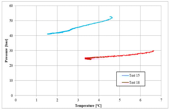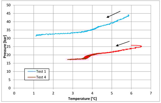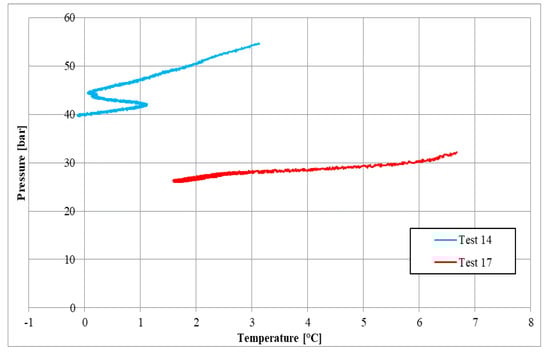 As in the previous section, the similarity between P–T diagrams belonging to tests carried out with methane and tests carried out with carbon dioxide is significantly more pronounced than in tests realized in pure demineralized water. Here, the comparison between Test 14 (CH4) and Test 17 (CO2) needs to be deepened. In the presence of relatively low temperatures, the methane diagram seemed to approach the respective carbon dioxide diagram. However, the methane curve lowering occurred in correspondence with temperature values that were not reached during the CO2 formation experiment. Moreover, even in this case, the hydrate production and growth from a new nucleation site led to a temporary temperature increase; meanwhile, pressure continued to decrease.