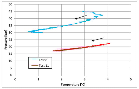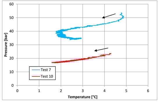 From Table 10, the effect of initial pressure on the process efficiency clearly appears. While experiments carried out with a starting value lower than 50 bar have an efficiency higher than 0.9, tests starting with a pressure higher than 60 bar show a significantly lower efficiency (in the range 0.50–0.55, with the only exception being Test 4, where the efficiency is anyway lower than Tests 1–3). Comparing pairs (Pi–η) between tests shown in Table 10 and tests described in the present work, the influence of initial pressure on the process efficiency clearly appears.