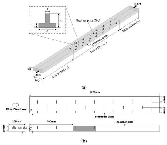 Figure 1 shows the computational domain of the SAH and geometric parameters of the T-shaped rib. Only a half of the entire SAH domain is included in the computational domain using symmetric conditions. The computational domain consists of three sections; inlet section (800 mm × 150 mm × 50 mm (L1 × W/2 × H)), test section (1200 mm × 150 mm × 50 mm (L2 × W/2 × H)), and outlet section (500 mm × 150 mm × 50 mm (L3 × W/2 × H)). This computational domain for evaluating the performance of the SAH was set according to the guidelines of the ASHRAE standard 93–97 [], and the lengths of the inlet and outlet sections of the domain are 5(WH)0.5 and 2.5(WH)0.5, respectively.