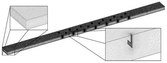 The upper wall (i.e., heat absorber plate) of the test section absorbs solar energy, and air is heated as it flows from the inlet to the outlet of the channel. The obstacles, T-shaped ribs, are attached to the heat absorber plate. Thirteen rows of ribs are arranged in a zigzag, as shown in Figure 1a. The thickness of the rib is 0.5 mm, and t is 8 mm. Each row contains one or one and a half ribs in the computational domain. The first row of ribs is located 71.75 mm downstream of the inlet of the test section.