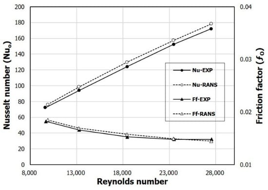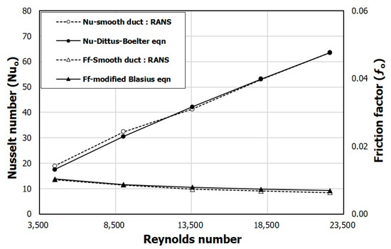 In addition, the validation test was also performed for the case with obstacles. The numerical results are compared with the experimental data obtained by Bekele et al. [] for the SAH with triangular obstacles under the same boundary conditions, as shown in Figure 4. The numerical results agree well qualitatively with the experimental data. In the results for the Nusselt number, the computational and empirical slopes according to the Reynolds number are exactly the same but, quantitatively, they show a small difference unlike the case without obstacles. The average relative error for the Nusselt number compared to the experimental data within the tested Reynolds number range is less than 4.43%, and that for the friction factor is less than 1.94%, which indicates that the accuracy of the numerical analysis results is acceptable for further calculations.