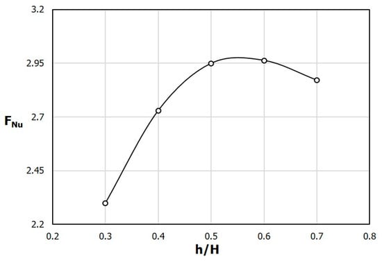 Variation of the performance parameter related to heat transfer (FNu) with the ratio of the rib height to the channel height (h/H) (the ratio of the rib width to the channel width (e/W) = 0.1).