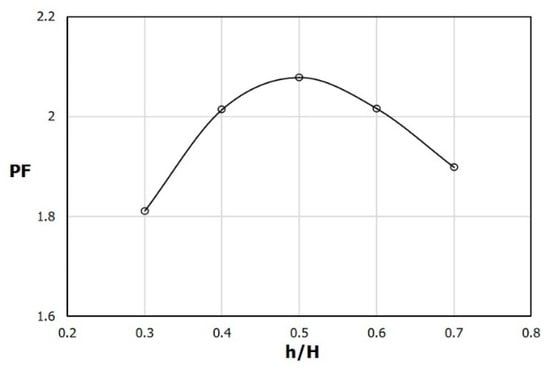 Variation of performance factor (PF) with h/H (e/W = 0.1).