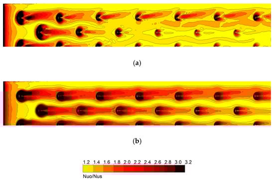 Nusselt number distributions on the heated surface for different h/H. (a) h/H = 0.3, (b) h/H = 0.5.