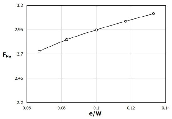 Figure 10, Figure 11, Figure 12, Figure 13 and Figure 14 show the effects of the ratio of the rib width to the channel width (e/W) on the performance of the SAH. Figure 10 and Figure 11 show the variations of the two performance parameters, FNu and Ff, respectively, with e/W, in a range of 0.067 ≤ e/W ≤ 0.133. As e/W increases, both FNu and Ff increase almost linearly. This is presumed to be a phenomenon that occurs because both the turbulence intensity and pressure loss increase due to the increase in the area of the obstacles as e increases while the height h is kept constant. In the PF distribution shown in Figure 12, the maximum value is found around e/W = 0.08, but the overall variation with e/W is very small compared to that in Figure 7 for h/H.