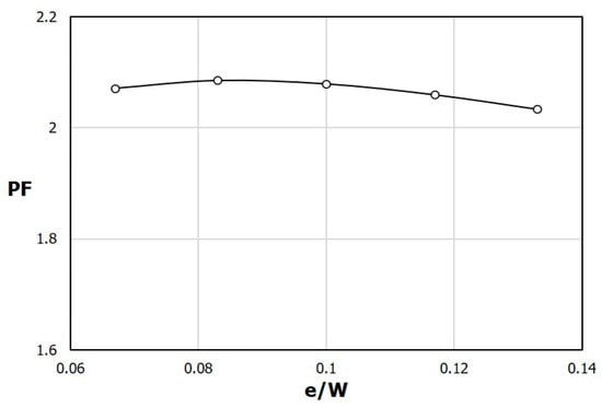 Variation of PF with e/W (h/H = 0.5).