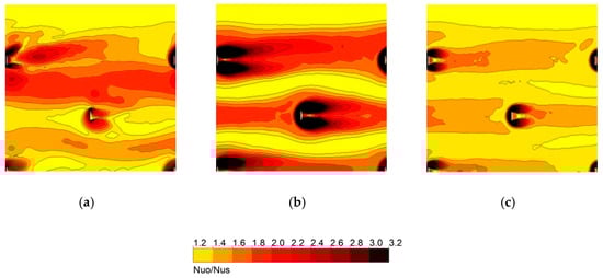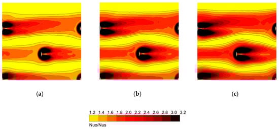 To prove the validity of the numerical analysis, the numerical results for the Nusselt number, Nuo, and friction factor, fo, are compared with corresponding empirical formulas for different Reynolds numbers in the flow channel without obstacles, as shown in Figure 3. The numerical results show good overall agreement with the empirical formulas. As Reynolds number increases, the relative error tends to decrease in the case of Nuo. Compared with the experimental data, the average relative error of the computed Nusselt numbers within the tested Reynolds number range is less than 3.29%, and it is less than 2.71% for the friction factor.