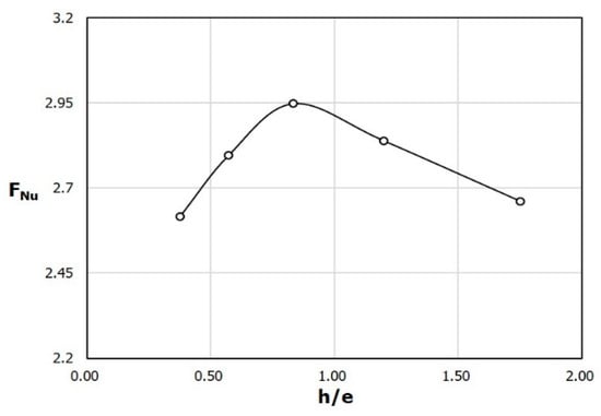 Since the change in the pressure drop appears small over the entire range of h/e, the variation of the performance factor PF with h/e, shown in Figure 17, shows a qualitatively similar variation to that of FNu (Figure 15). The maximum value of PF also appears at h/e = 0.83.