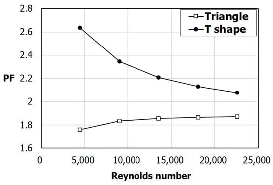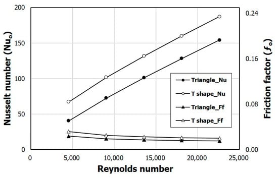 To demonstrate the superiority of the heat transfer performance of the SAH with T-shaped ribs proposed in this study, the performance parameters are compared with the experimental data for the SAH with triangular ribs measured by Bekele et al. [], as shown in Figure 19 and Figure 20. The comparison was performed for the same cross-sectional area of the ribs and the same spacing between the ribs. The T-shaped rib used for the comparison is the reference rib presented in Table 2. Figure 19 shows the variations of the Nusselt number (Nuo) and friction factor (fo) with Reynolds number. In the case of the friction factor, the T-shaped ribs show a slightly larger value than that with the triangular ribs in the entire Reynolds number range. However, the Nusselt number shows a large uniform improvement at all Reynolds numbers. Compared to the triangular ribs, the T-shaped ribs show Nusselt numbers that are 65% higher at Re = 4510 and 21.5% higher at Re = 22,600. On the other hand, a 35% higher pressure drop occurs at Re = 4510 and a 31% higher pressure drop occurs at Re = 22,600 than for the triangular ribs. Figure 20 shows the comparison of the performance factor PF between the two different ribs. The PF of the T-shaped ribs is 49.7% higher at Re = 4510, and 11% higher at Re = 22,600 than for the triangular ribs.