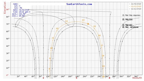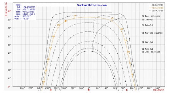 In this context, this paper aims to report the process of construction and automation of a two-axis micro-controlled solar tracker with a sensor tracking strategy. The electronics are based on an Arduino MEGA2560 and four LDR-type light sensors. The built prototype was able to track the Sun and position the solar panel with a tolerance of 1 degree, achieving 39.5% energy gain on a 13 summer-day period. The two-axis tracker was chosen due to the latitude where the prototype was installed (−24.25°). Figure 1 shows the Sun’s apparent position and the annual variation at latitude −24.25°, and Figure 2 presents this variation in a location with the same longitude but located on the equator line []. In locations further away from the equator line, the variation in the elevation angle throughout the year is considerably greater, which justifies the use of a two-axis system due to its positioning capability, allowing us to keep the panel perpendicular to the Sun’s rays in every season.