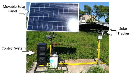 The Earth’s surface receives enough solar energy annually to supply 7500 times the world’s energy needs in the same period []. However, solar energy needs to be converted into electrical energy through the photovoltaic effect, discovered in 1839 by Edmond Becquerel, which consists of the transfer of photon energy to electrons in the semiconductor valence band, creating an electron-gap pair associated with a potential difference []. Since the power generated by a photovoltaic system depends on the amount of solar radiation received, new technologies are studied and developed to maximize the energy collected. Among them are the solar panel angular position optimization systems, known as the solar tracker [].