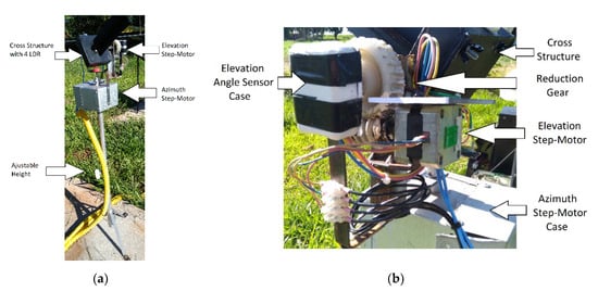 The solar tracker device is constructed in an aluminum frame, with height adjustable by screw on a tripod, equipped with two stepper motors that provide movement in the angles of elevation and azimuth. These stepper motors are connected to the rotation system by endless screw, which amplify movement accuracy, enabling four steps per degree. In addition, the endless screw system allows motion transmission only in the direction of the frame, reducing external wind and gravity action. The light sensor array is positioned at the top of the device, consisting of a 20 cm high and 6 cm wide polyvinyl chloride cross structure and 4 light-dependent sensors. Figure 4 shows the tracking device, with details for the endless screw system.