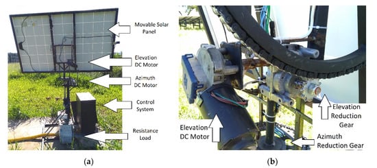 - Kaur, T.; Mahajan, S.; Verma, S.; Priyanka; Gambhir, J. Arduino based low cost active dual axis solar tracker. In Proceedings of the 2016 IEEE 1st International Conference on Power Electronics, Intelligent Control and Energy Systems (ICPEICES), Delhi, India, 4–6 July 2016; pp. 1–5. [Google Scholar]