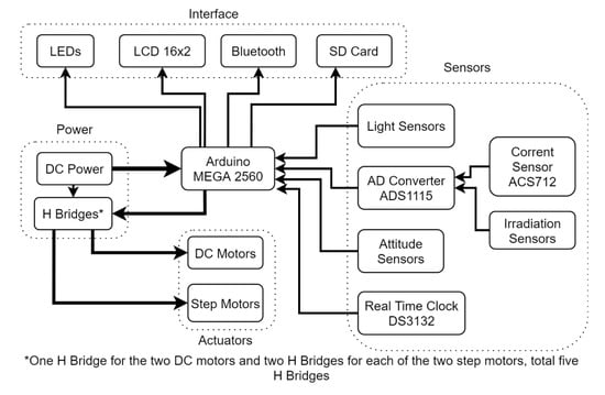 The electronics can be divided into five main modules, as shown in Figure 6. Control and processing are centralized on an Arduino MEGA2560, whose purpose is to communicate with the other blocks through analog, digital signals and communication protocols. The human machine interface module contains status indicator LEDs, a 16 × 2 LCD display that shows the measured and calculated quantities, a Bluetooth wireless communicator for laptop connection and a SD storage card. The sensing module include the luminosity sensors (LDR), current sensor ACS712 and a Spektron solar radiation sensor connected to an analog-to-digital integrated circuit ADS1115 with 16 bits resolution, potentiometers serving as an angle sensor and a DS3132 digital watch. Finally, the power module consists of a DC voltage source with a rated voltage of 12 V and a maximum current of 10 A, together with the stepping motors and DC motors in the full bridge inverter configuration.